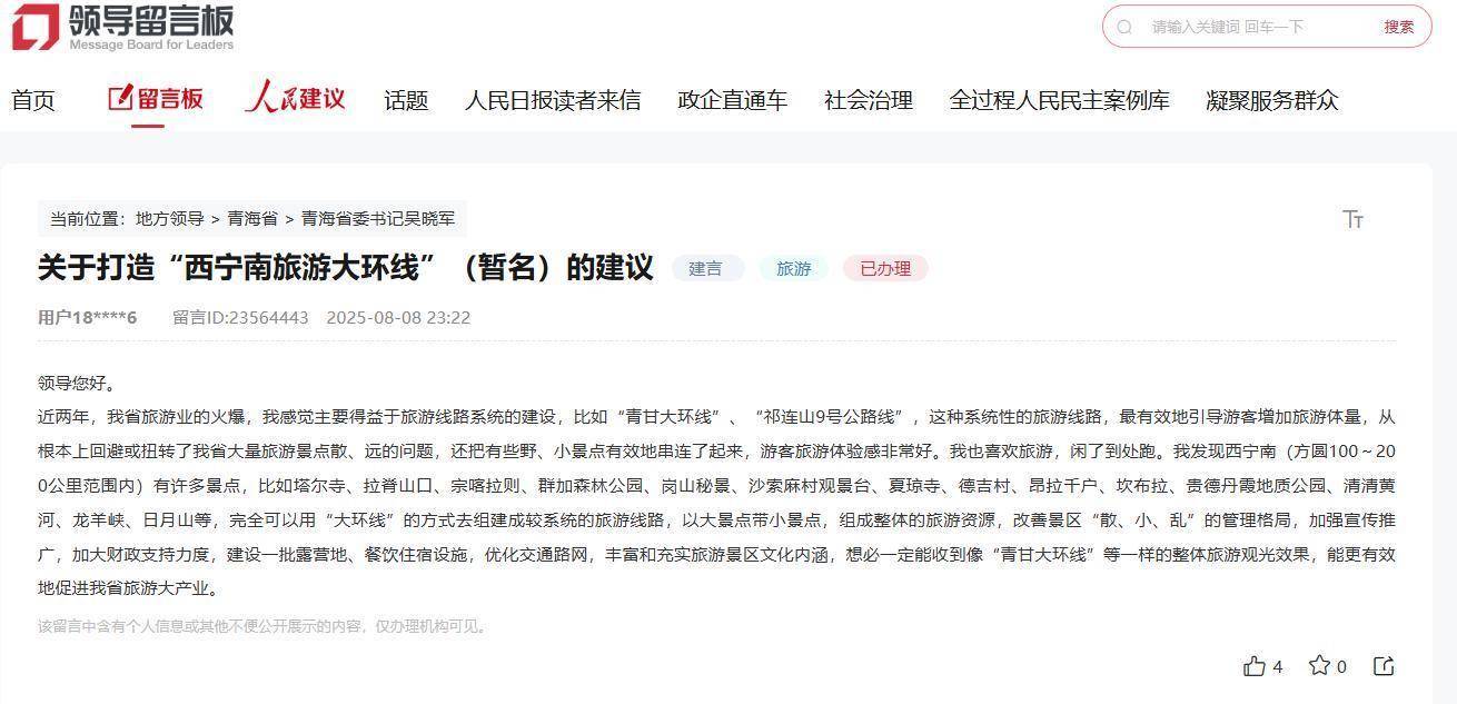 近日,有群众在人民网“领导留言板”留言建议青海打造西宁南旅游大环线。该群众建议,西宁南(方圆100至200公里范围内)有许多景点,比如塔尔寺、拉脊山口、宗喀拉则、群加国家森林公园、岗山秘景、沙索麻村观景台、夏琼寺、德吉村、昂拉千户、坎布拉世界地质公园、贵德地质公园、清清黄河、龙羊峡、日月山等,完全可以用“大环线”的方式去组建成较系统的旅游线路,以大景点带小景点,组成整体的旅游资源,改善景区“散、小、乱”的格局,加强宣传推广,加大财政支持力度,建设一批露营地、餐饮住宿设施,优化交通路网,丰富和充实旅游景区文化内涵,定能收到像“青甘大环线”等一样的整体旅游观光效果,能更有效地促进青海旅游产业发展。